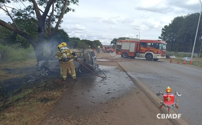 Carro em zigue-zague atropela pedestre, bate em árvore e pega fogo no DF; duas pessoas morreram